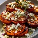 KROK 3: DODANIE FETY – Po upieczeniu posyp pokruszoną fetą na gorące bataty i wstaw z powrotem do piekarnika na dodatkowe 5 minut, aż ser lekko się roztopi.