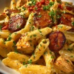 A delicious one-pan dish combining tender chicken, savory sausage, and pasta in a rich, creamy sauce with a Cajun kick.