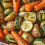 A quick and easy recipe for garlic herb roasted potatoes, carrots, and zucchini that turns simple ingredients into a deliciously satisfying dish.