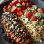 A delightful dish combining juicy grilled chicken with a sweet and tangy strawberry balsamic glaze alongside a crunchy Cotija cheese orzo salad, perfect for warm days.