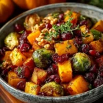 A delightful vegetarian side dish featuring roasted Brussels sprouts and butternut squash, enhanced by the sweetness of maple walnuts and cranberries.
