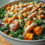 A delicious and healthy salad packed with roasted sweet potatoes, chickpeas, and kale, drizzled with a creamy tahini dressing.