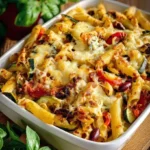 Sycąca zapiekanka z makaronem, mięsem mielonym i warzywami, idealna na obiad lub kolację.